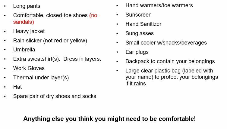 Be prepared for any kind of weather. We have had sun, snow, rain and high winds over the years and the temperatures have dropped as low of 50 some years.